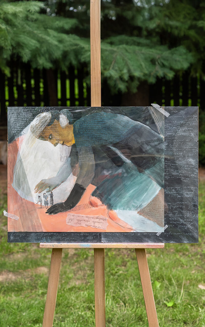 Холст, змешаная тэхніка (акварэль, аловак, туш, лак),