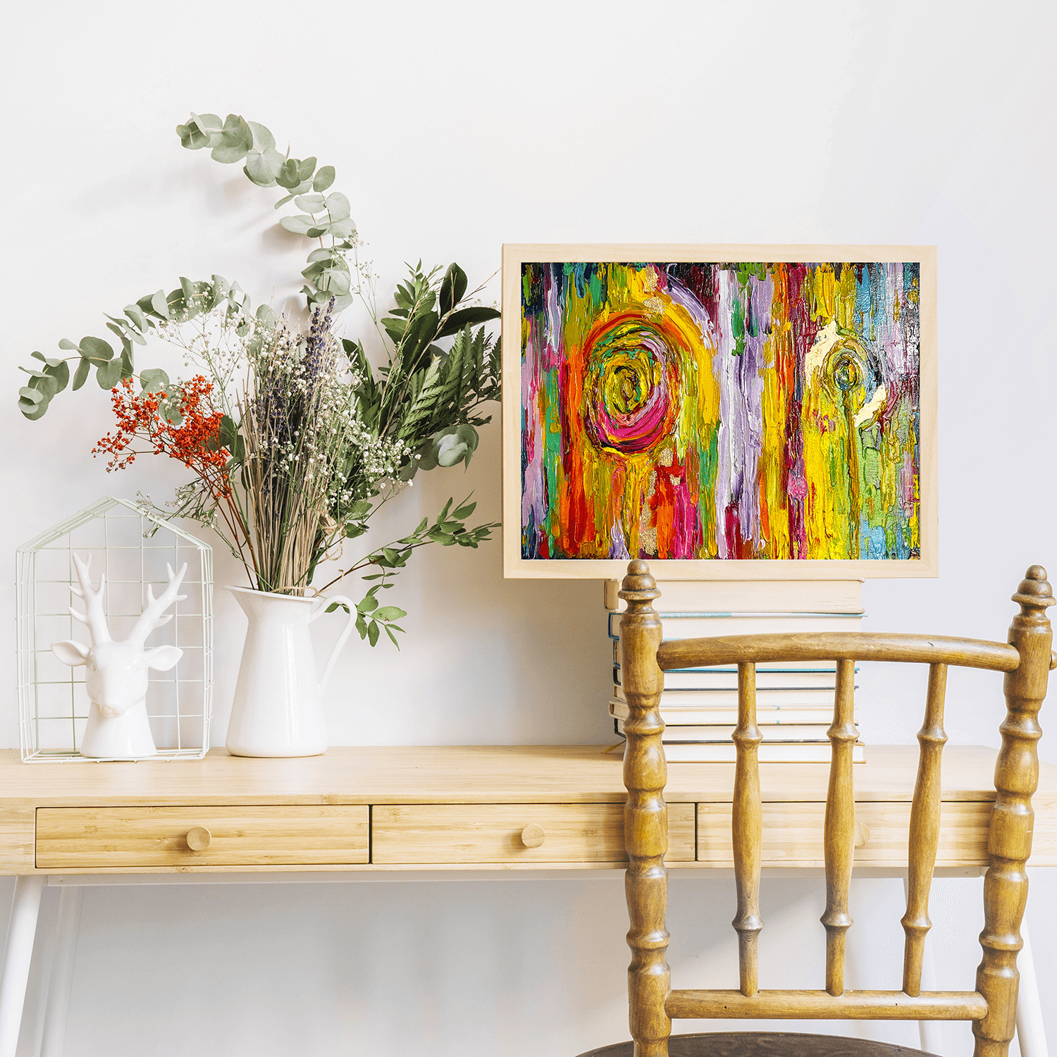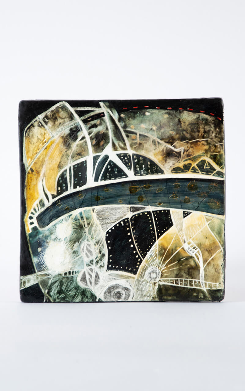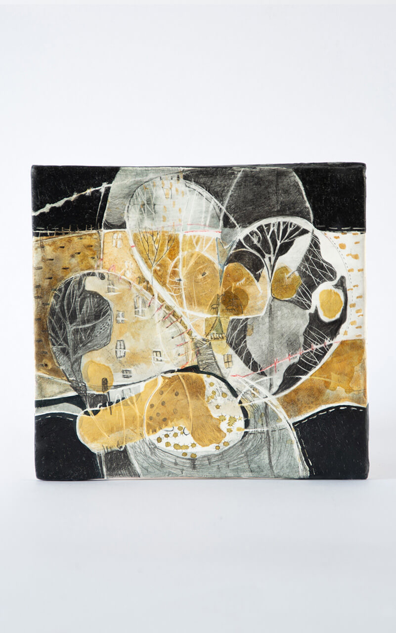 Драўнянапаходная пліта hande made, акрылавыя фарбы, сілікон, залаты пігмент, лак.